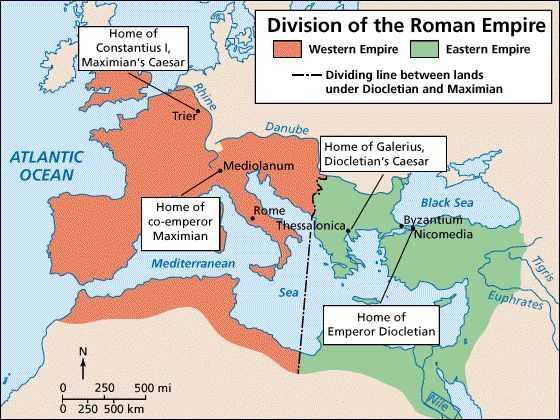 Sementara itu Romawi mulai hancur, kaisar Diokletianus membelah Romawi menjadi empat bagian. Kekaisaran Romawi terlalu besar dan rumit untuk dijalanin dari satu pusat. Rencana awalnya membagi kekaisaran Romawi menjadi empat tetapi pada kenyataannya terbagi menjadi dua, Romawi barat dan romawi timur (Byzantium).