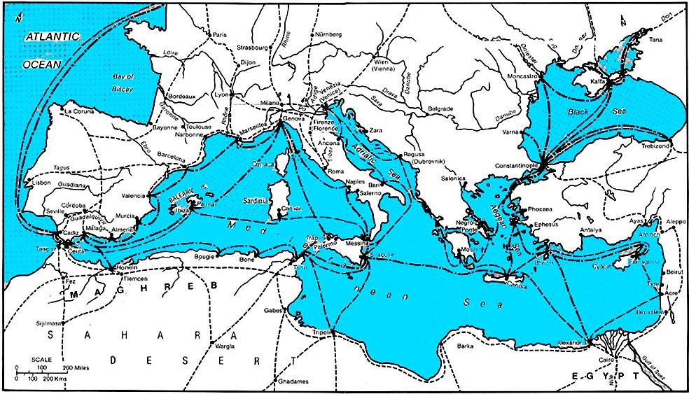 Lama sebelum Islam lahir, dua peradaban diantara samudera Atlantik dan teluk Benggala terbentuk. Masing-masing punya jaringan dan rute perdagangan yang berbeda; satu laut dan satu darat. Yang rute laut kuno di daerah Mediterania. Disini muncul bangsa Mycenaea, Kreta, Fenisia, Yunani dan Roma. Dari daerah inilah berasal peradaban barat.