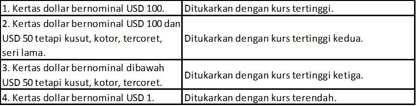 Dari papan tersebut juga bisa kita lihat untuk mata uang dollar, kursnya terbagi menjadi tiga yaitu USD besar, USD kecil dan USD 1. Secara teknisnya setiap money changer memiliki kebijakan yang berbeda-beda akan tetapi dasar pembagian tersebut hampir sama yaitu berdasarkan pecahan uang dollar yang ingin kita tukarkan, jika pecahan yang ingin ditukarkan bernominal USD 100, maka digunakan kurs USD besar, jika pecahan yang ingin ditukarkan bernominal antara USD 5, 10, 20, 50 maka digunakan kurs USD kecil, sedangkan jika pecahan yang ingin ditukarkan bernominal USD 1 maka digunakan kurs USD 1. Selisih jual dan belinya juga berbeda antara ketiga jenis kurs tersebut sebagai berikut: