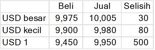 Jadi keuntungan money changer tersebut sebenarnya adalah selisih dari kurs jual dengan kurs beli. Dari contoh diatas, selisihnya adalah Rp 10.005 – Rp 9.975 = Rp 30, berarti dari setiap USD 1 transaksi, money changer mengambil keuntungan sebesar Rp 30.