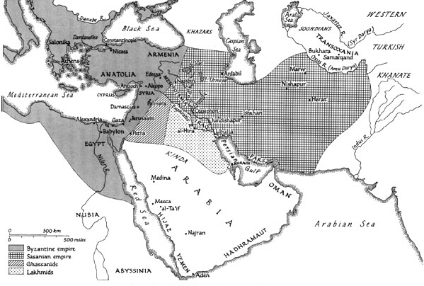 Di masa-masa awal lahir dan berkembangnya Islam di masa kenabian nabi Muhammad SAW antara tahun 610 – 632 M di jazirah Arab, daerah tersebut diapit oleh dua adikuasa dunia, kekaisaran Bizantium (Romawi) di sebelah barat dan kerajaan Sassanid (Persia) di sebelah timur, juga kerajaan Yaman di selatan.