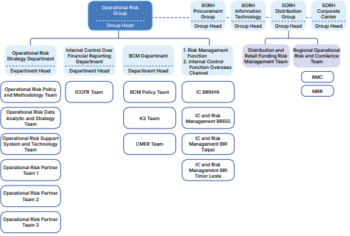Implementasi ICoFR dilakukan secara bertahap dalam empat fase, dimulai sejak tahun 2021 dengan cakupan awal Kredit Mikro, Kredit Ritel & Menengah, Customer Deposit, dan Financial Reporting, kemudian diperluas pada fase berikutnya mencakup Kredit Konsumer, Kredit Korporasi, Treasury, Trade Finance, dan Fixed Asset. Sesuai NOKEP: 3927 DIR/PPM/11/2024, fungsi ICOFR telah diintegrasikan ke dalam Operational Risk Group (ORD) guna memperkuat tata kelola dan koordinasi lintas fungsi. Pada tahun 2025, BRI melaksanakan tahap transisi Fase 3.5 berupa pendalaman atas sembilan ruang lingkup utama sebagai respons terhadap perubahan proses bisnis dan pemenuhan ketentuan SK 5/DKU.MBU/11/2024 yang mensyaratkan cakupan ICOFR minimal 2/3 materialitas laporan keuangan, melalui pengkinian BPM dan RCM, pelaksanaan CSA, serta pengujian rancangan pengendalian untuk memastikan efektivitas pengendalian secara berkelanjutan. Adapun struktur organisasi ORD saat ini sebagai berikut: