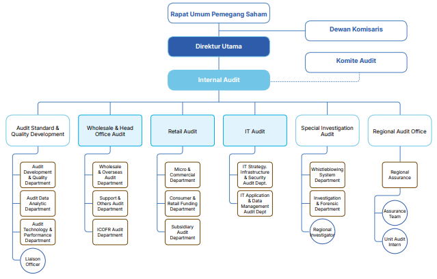 Dalam memastikan efektivitas desain dan pelaksanaan pengendalian internal, BRI telah melakukan berbagai aktivitas pengujian. Test of One (ToO) telah dilaksanakan atas 335 key controls dengan dukungan 193 working papers, disusul Control Self‑Assessment (CSA) atas 762 key controls dengan 645 working papers yang mencerminkan keterlibatan aktif unit bisnis dalam memastikan kepatuhan dan efektivitas kontrol. Selain itu, Test of Design (ToD) dilakukan atas 242 key controls dengan 243 working papers pada ruang lingkup treasury, trade finance, dan fixed assets. Walaupun beberapa potensi defisiensi desain teridentifikasi, seluruhnya telah direncanakan untuk diremediasi melalui perbaikan berkelanjutan yang digerakkan secara terstruktur. Adapun struktur organisasi SKAI saat ini sebagai berikut: